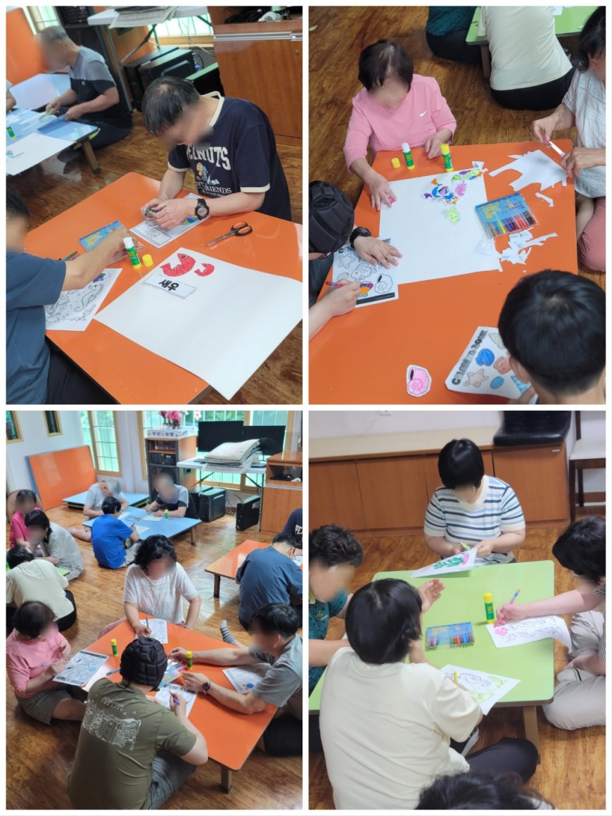 더운 여름이라 바다 속 해양 생물들 그림을 색칠하고 오려서 붙여보는 시간을 가졌습니다.