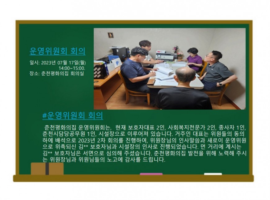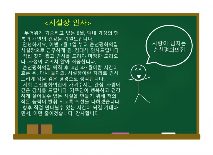 8월 춘천평화의집 소식지 생활교사 0 649 2023.09.04 20:39 무더위가 기승하고 있는 8월 춘천 평화의집 소식지를 전달해드립니다!!'찾아가는 요가교실', '인권상황점검', '운영위원회 회의' 등다양한 활동을 통해 거주인의 인권 향상과 행복함을 위해 나아가는 모습을춘천평화의집 소식지를 통해 만나보시길 바랍니다!!